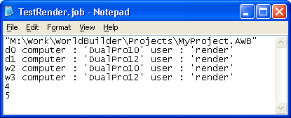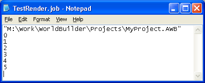 Network rendering is accomplished by creating and executing the so-called WorldBuilder job files. Job files are ASCII text files, the headline of which is the full pathname to the *.AWB file, and the other lines initially contain the frame numbers to be rendered. An example of contents of a newly created job file is shown below: