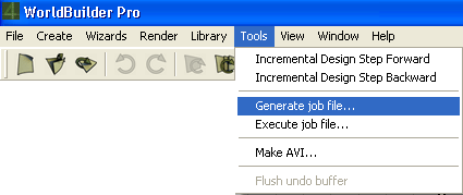 You can create a job file either manually or automatically from the registered copy of WorldBuilder. To do so, first of all, load the project file you are about to render. When the project file is loaded select Tools / Generate job file in the main menu line of WorldBuilder (see the left panel below). Just the Generate Job File dialog appears, (the right panel) which allows you to locate the file and set the required frame range.