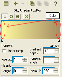 In the Property Page, use the Color Picker to select a light yellow color for the Horizon Gradient Key, and a darker brown color for the Zenith (to assign a color from the picker, click OK and then click on the gradient just above the key slider at either end of the gradient).